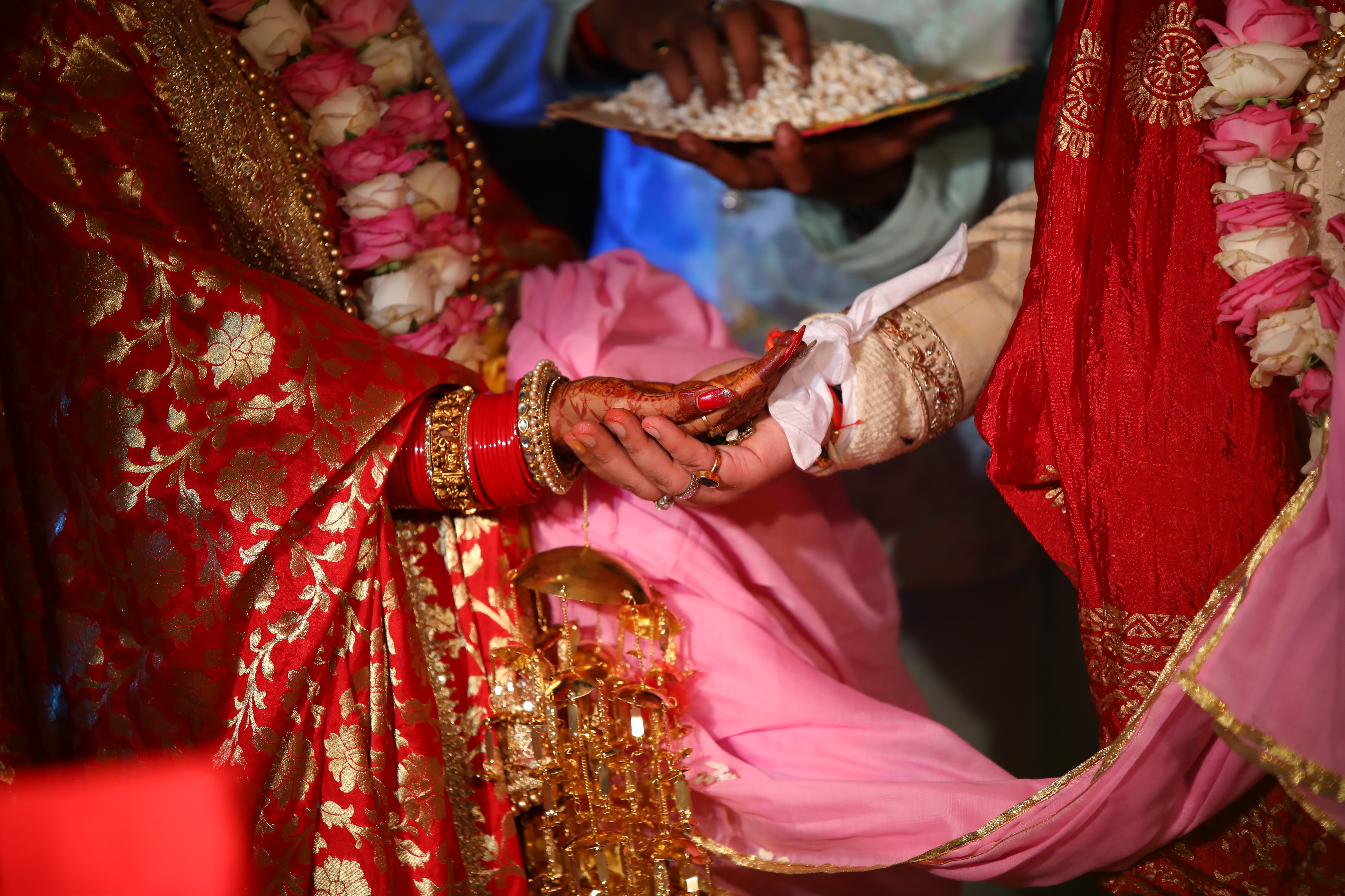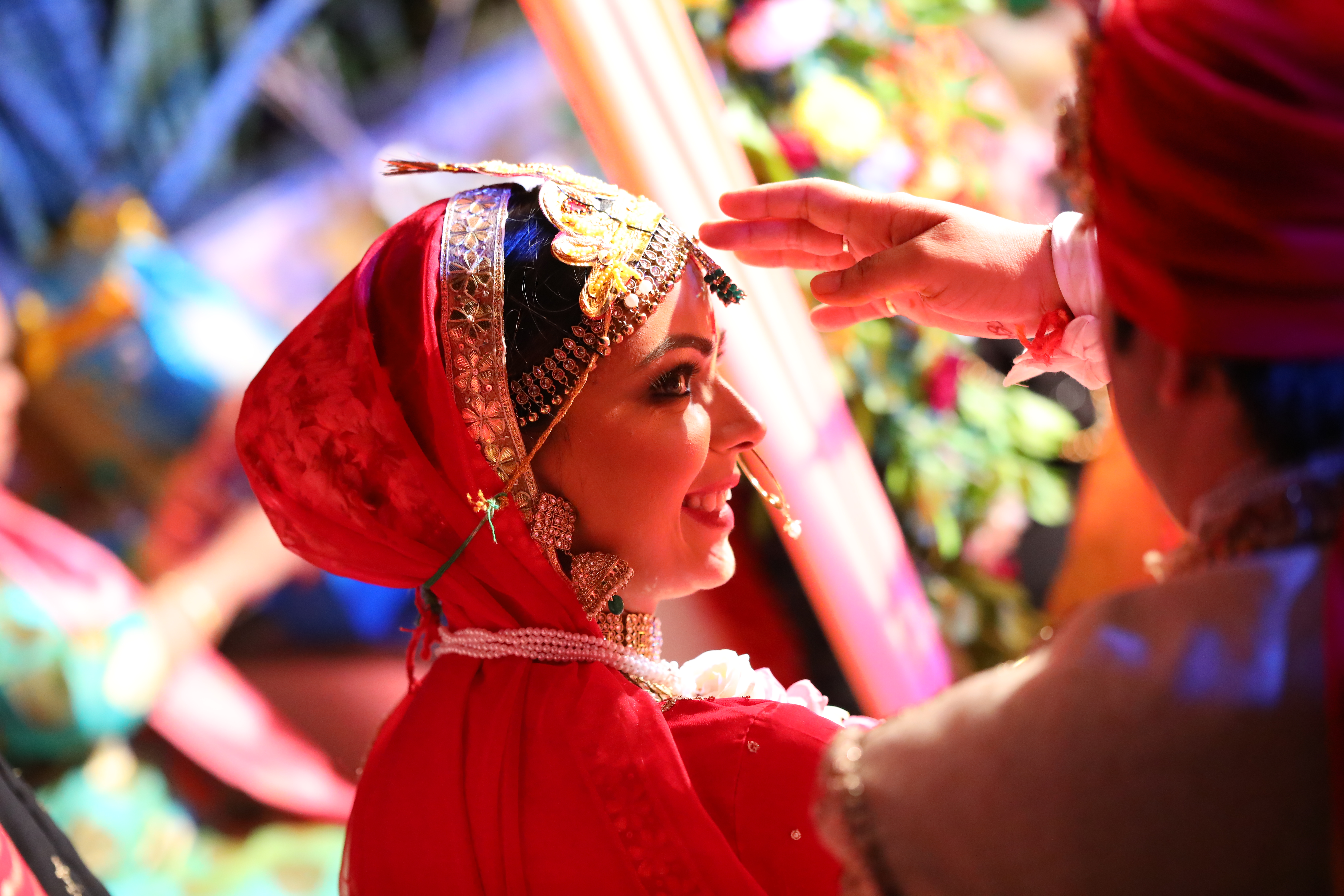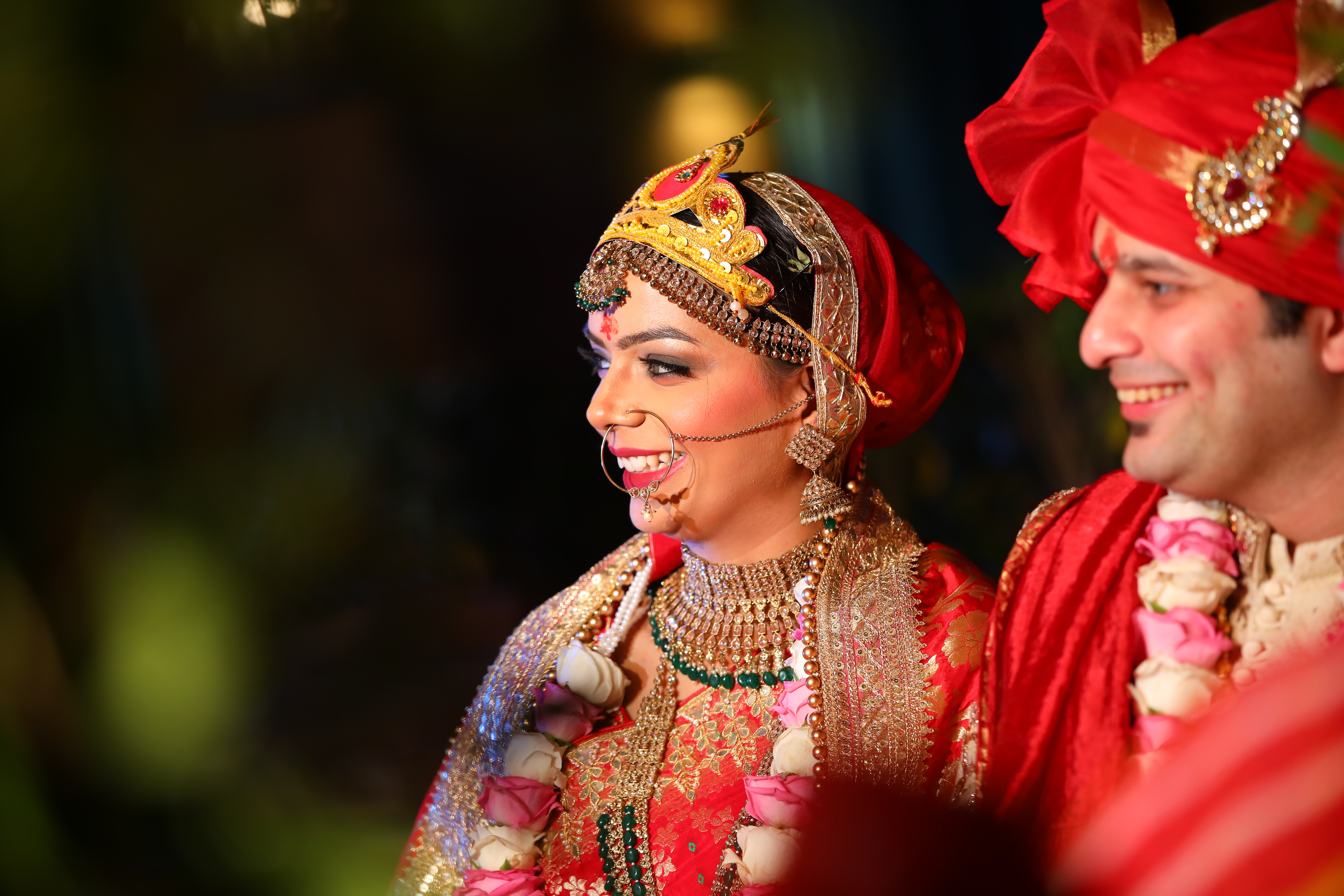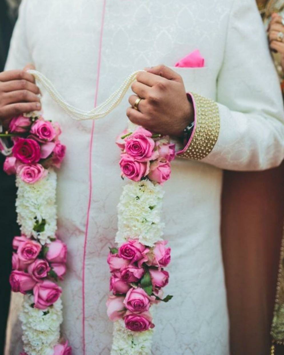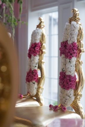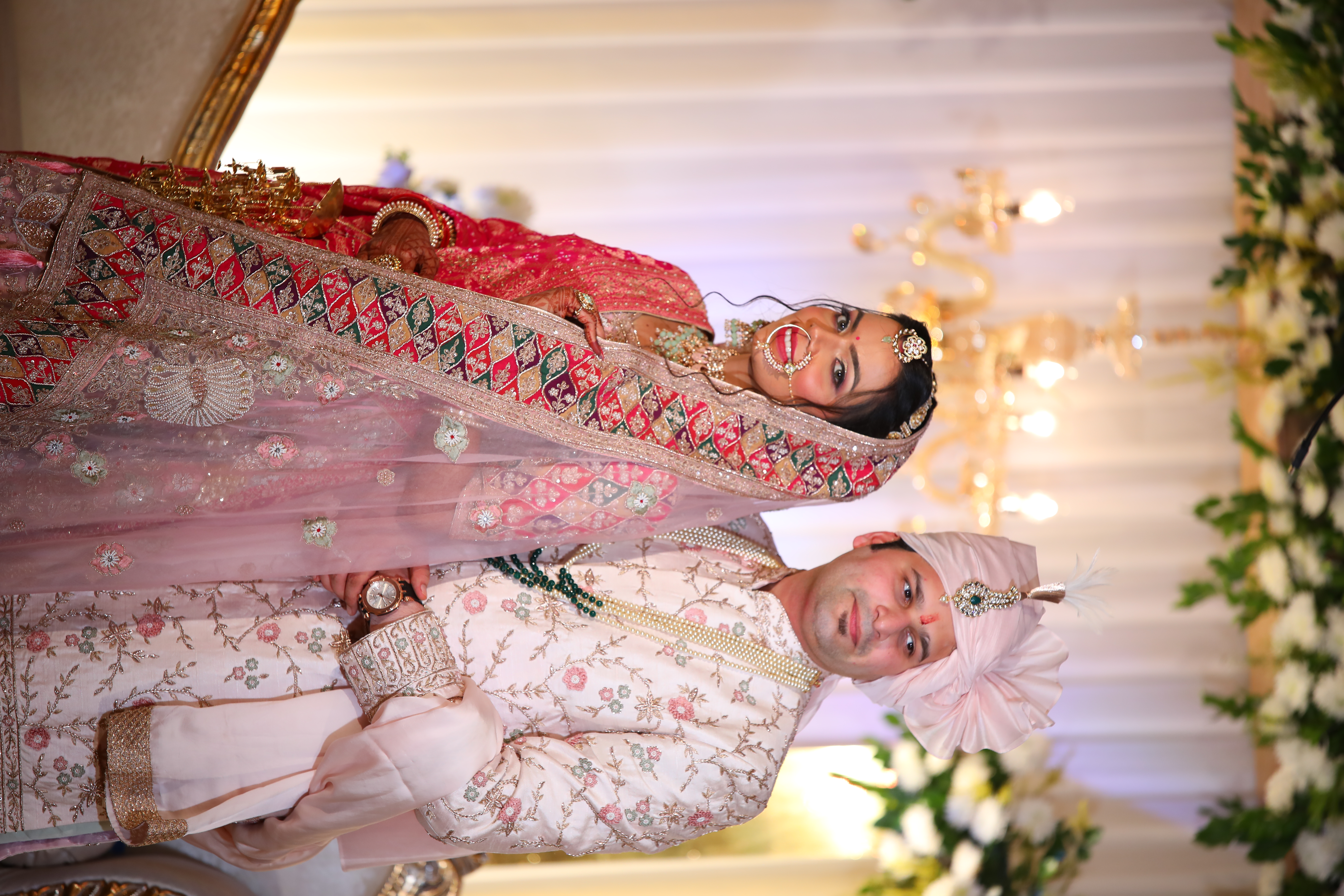 Witness the magic of love as two souls exchange garlands amidst a backdrop of enchanting beauty, embracing the warmth and romance of this sacred union.